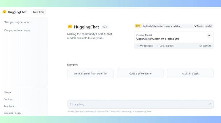 HuggingFace, an AI startup, recently unveiled HuggingChat, an open-source AI chatbot with 30 billion parameters. The new chatbot reportedly responds immediately to prompts and is trained using GPT-4 data. In any case, clients can visit the HuggingFace site to give their hands a shot some generative simulated intelligence items in light of GPT-4.